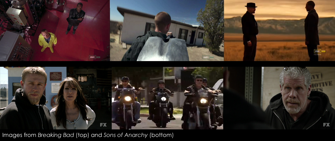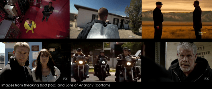 All of these may be factors– but the real answer, I believe, is that they employ a very conventional cinematic language. This had been true of SOA since the beginning, but it didn’t hit me until I realized, watching late one night, that I could accurately predict the commercial breaks and even scene breaks of the episode. The shots consisted of establishing, medium, and reverse. The editing was clean and non-descript, following the cinematography. It was entirely constructed of the Hollywood patterns we’ve all been accustomed to since childhood. It was all the same; why would I not be able to predict it?